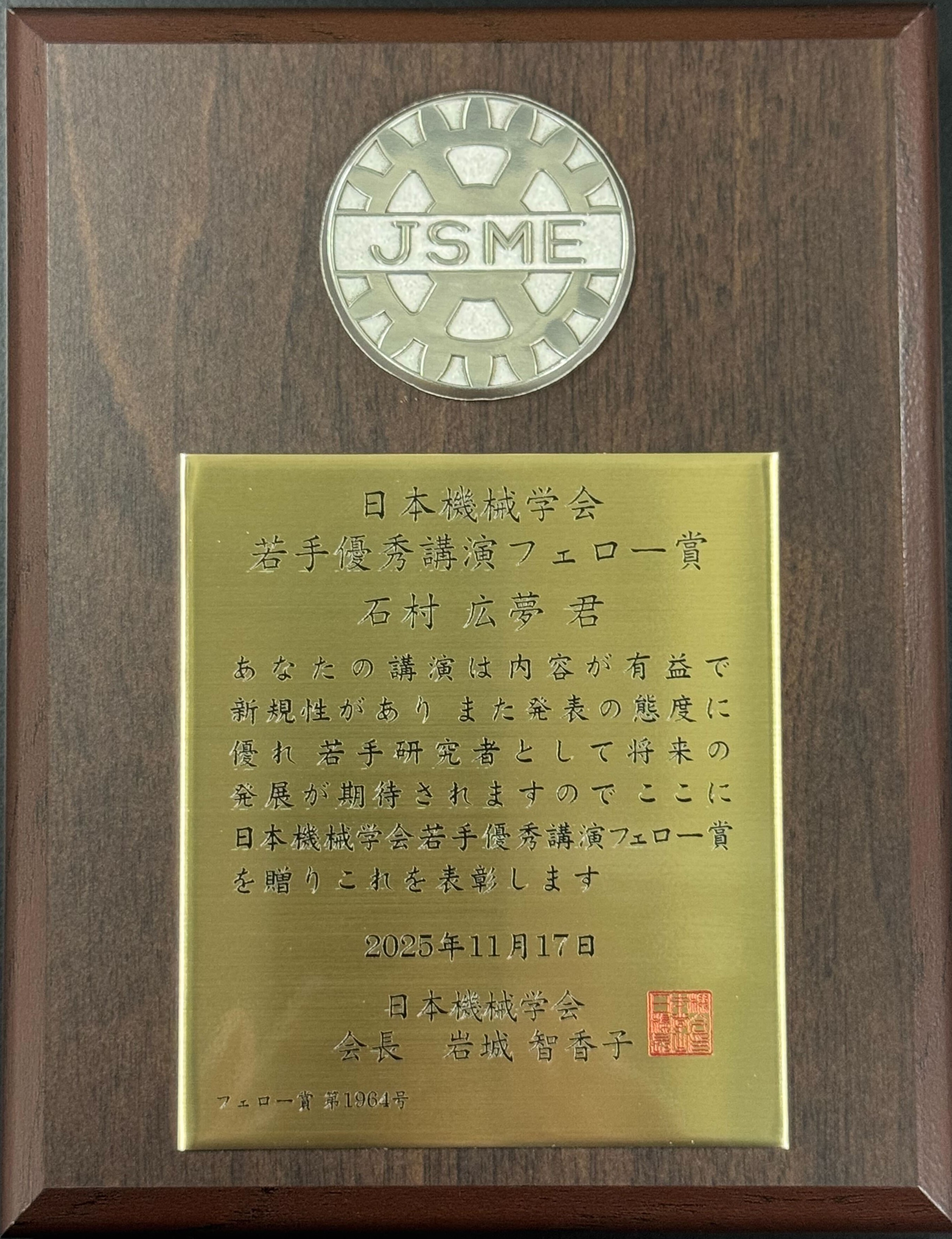 2025.11 石村 広夢さん 「日本機械学会若手優秀講演フェロー賞」受賞 |