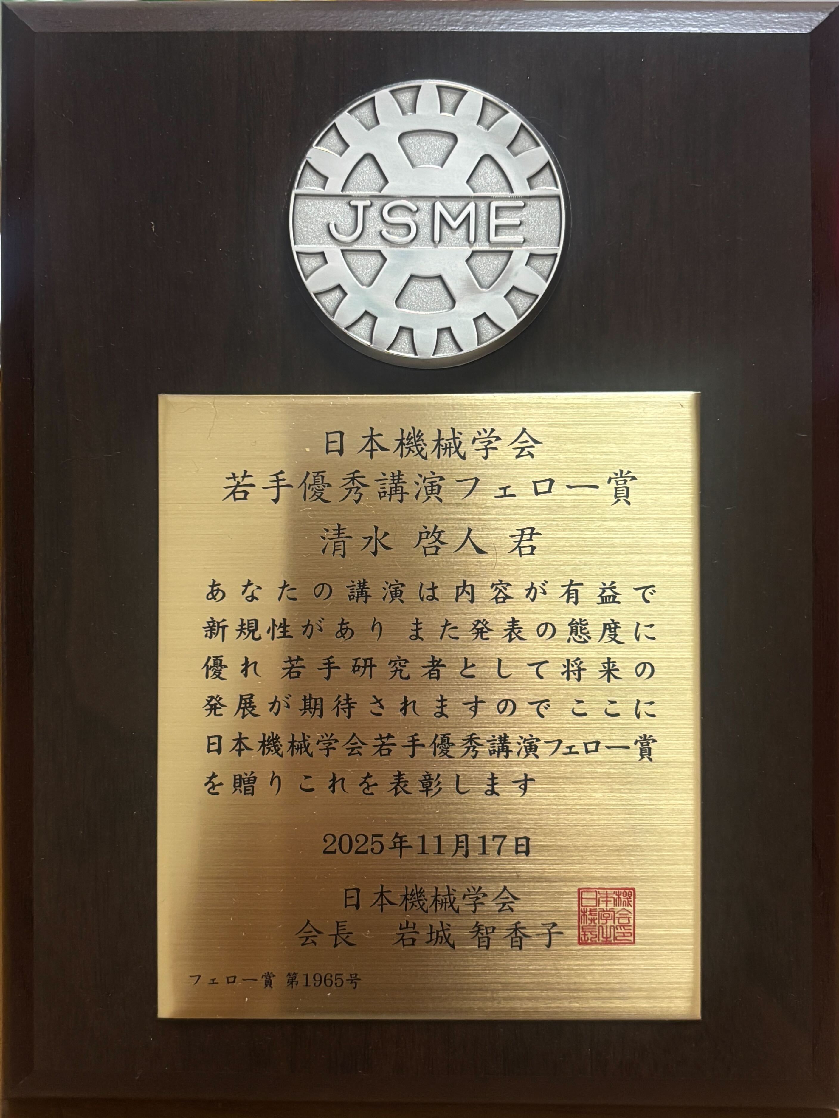 2025.11 清水 啓人さん 「日本機械学会若手優秀講演フェロー賞」受賞 |