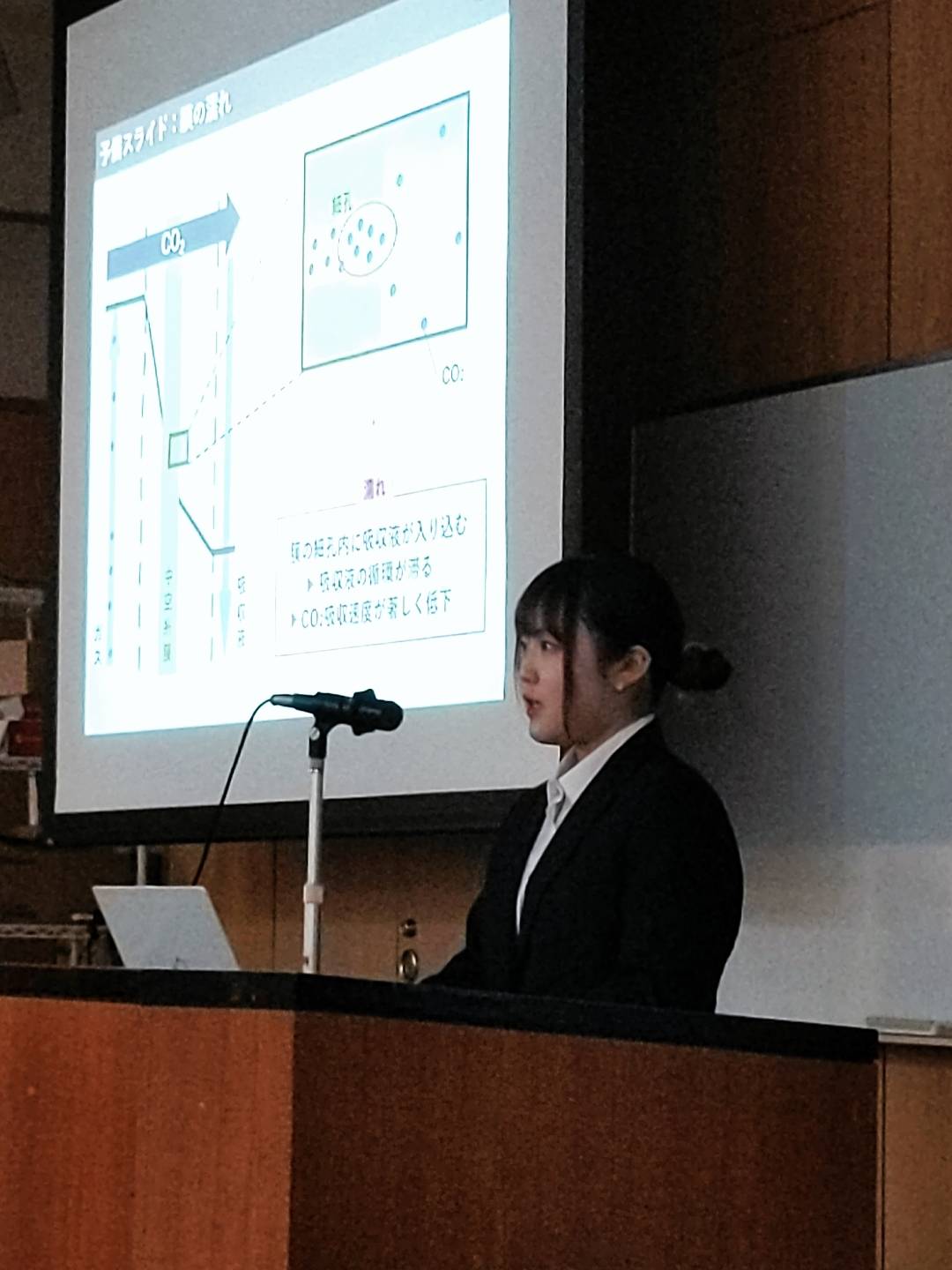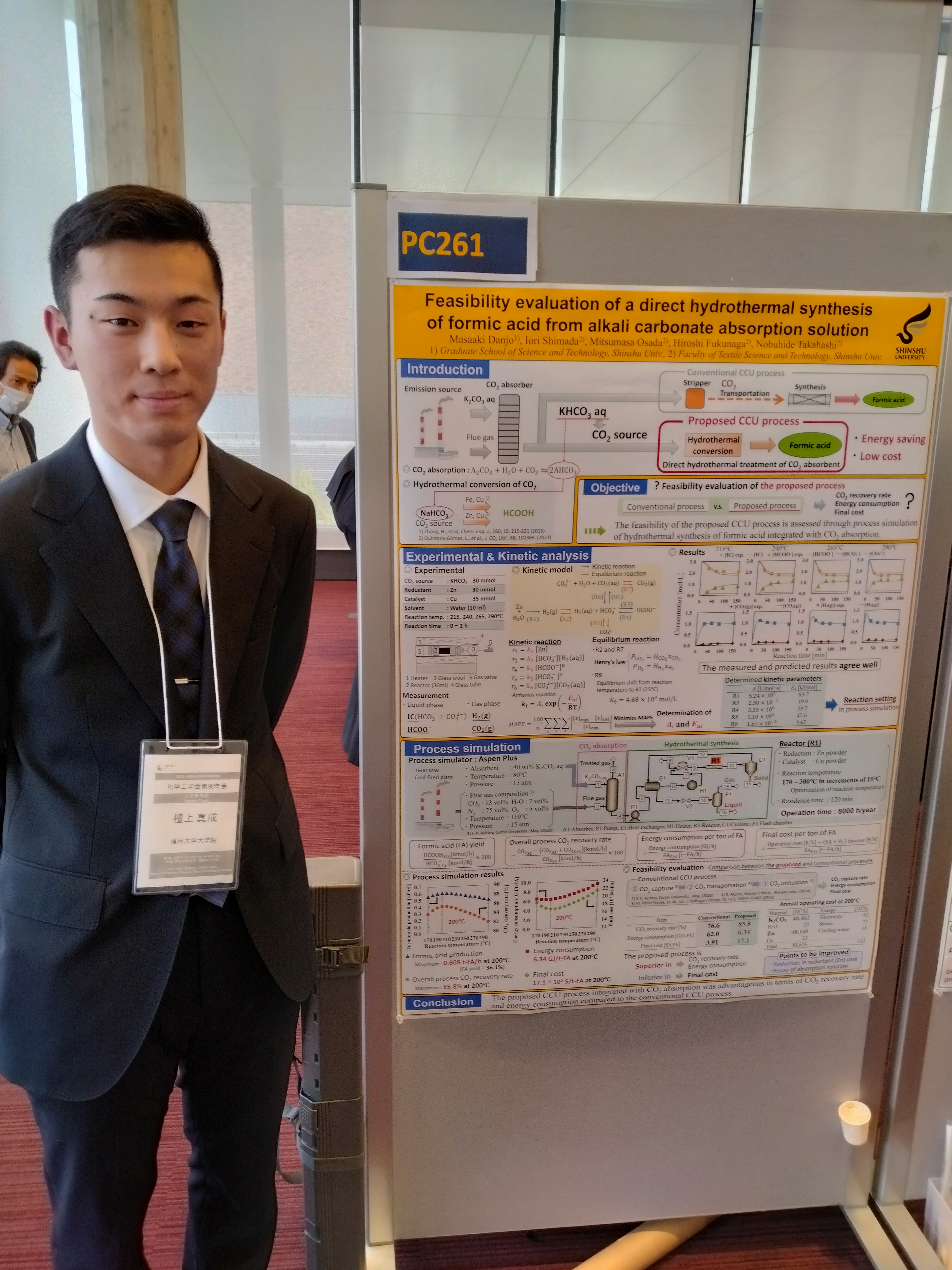 2021.9.23 化学工学会第52回秋季大会にて、M1の小林萌生さんが「スルホン基修飾多孔質粒子の添加がアミン吸収液からのCO2放散に及ぼす影響」という題目で、M1の圷良太君が「CO2からのギ酸水熱合成における炭酸アルカリ吸収液の濃度の影響」という題目で研究発表(口頭)を行いました。