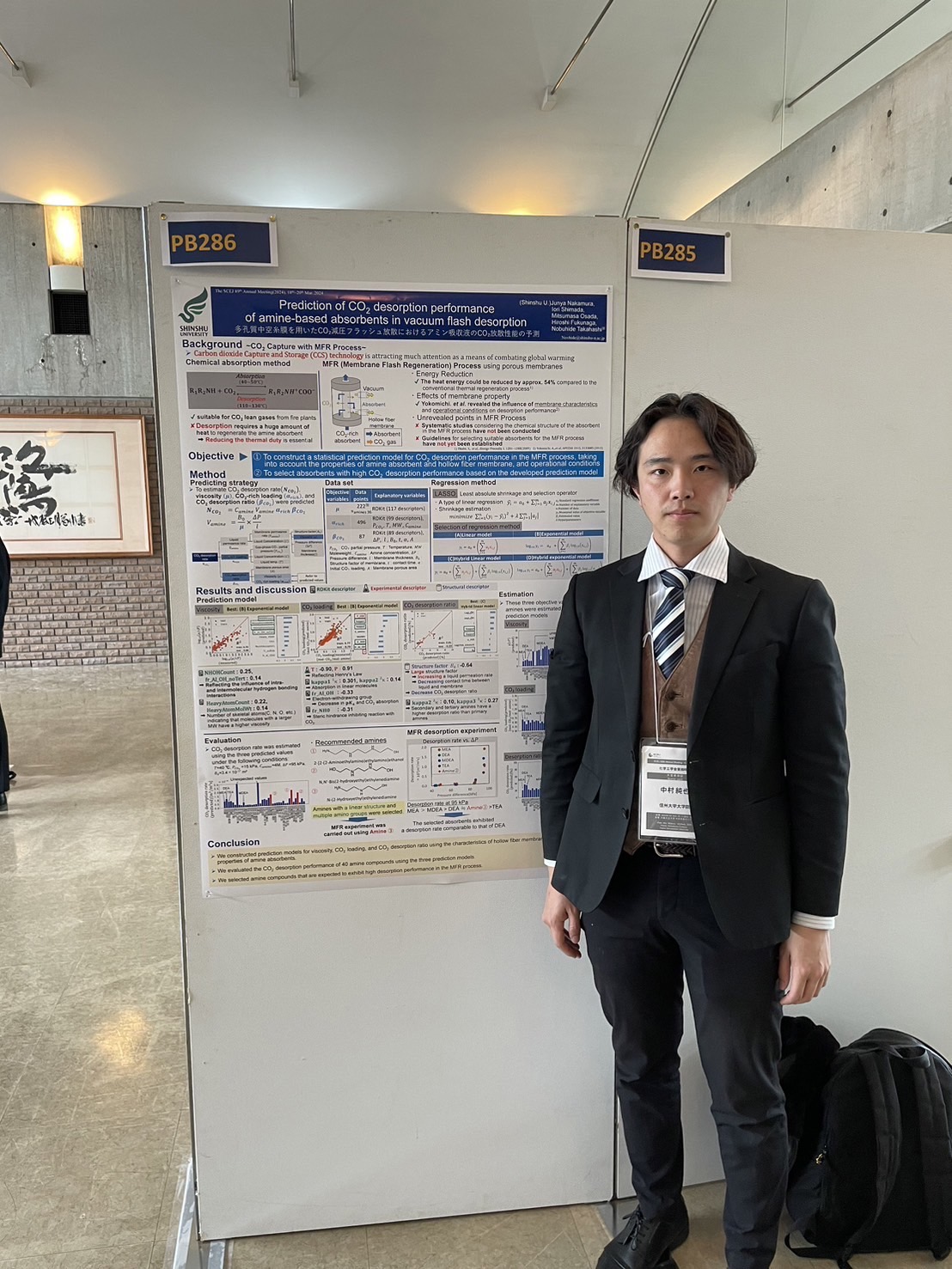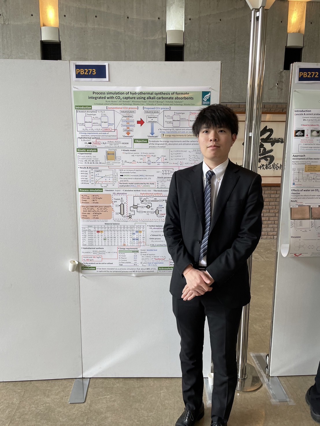 2024.3.18-20 化学工学会第89年会(@大阪府立大学)にて、B4の多田君が「ソルガムの成分組成が発熱量に及ぼす影響」という題目で、M1の鈴木君が「バガスの熱分解過程におけるバイオ炭収率と元素組成の予測」という題目で、M2の中村君が「多孔質中空糸膜を用いたCO2減圧フラッシュ放散におけるアミン吸収液のCO2放散性能の予測」という題目で、M2の圷君が「炭酸アルカリ吸収液を用いたCO2吸収と統合したギ酸水熱合成のプロセスシミュレーション」という題目で、それぞれポスター発表を行いました。