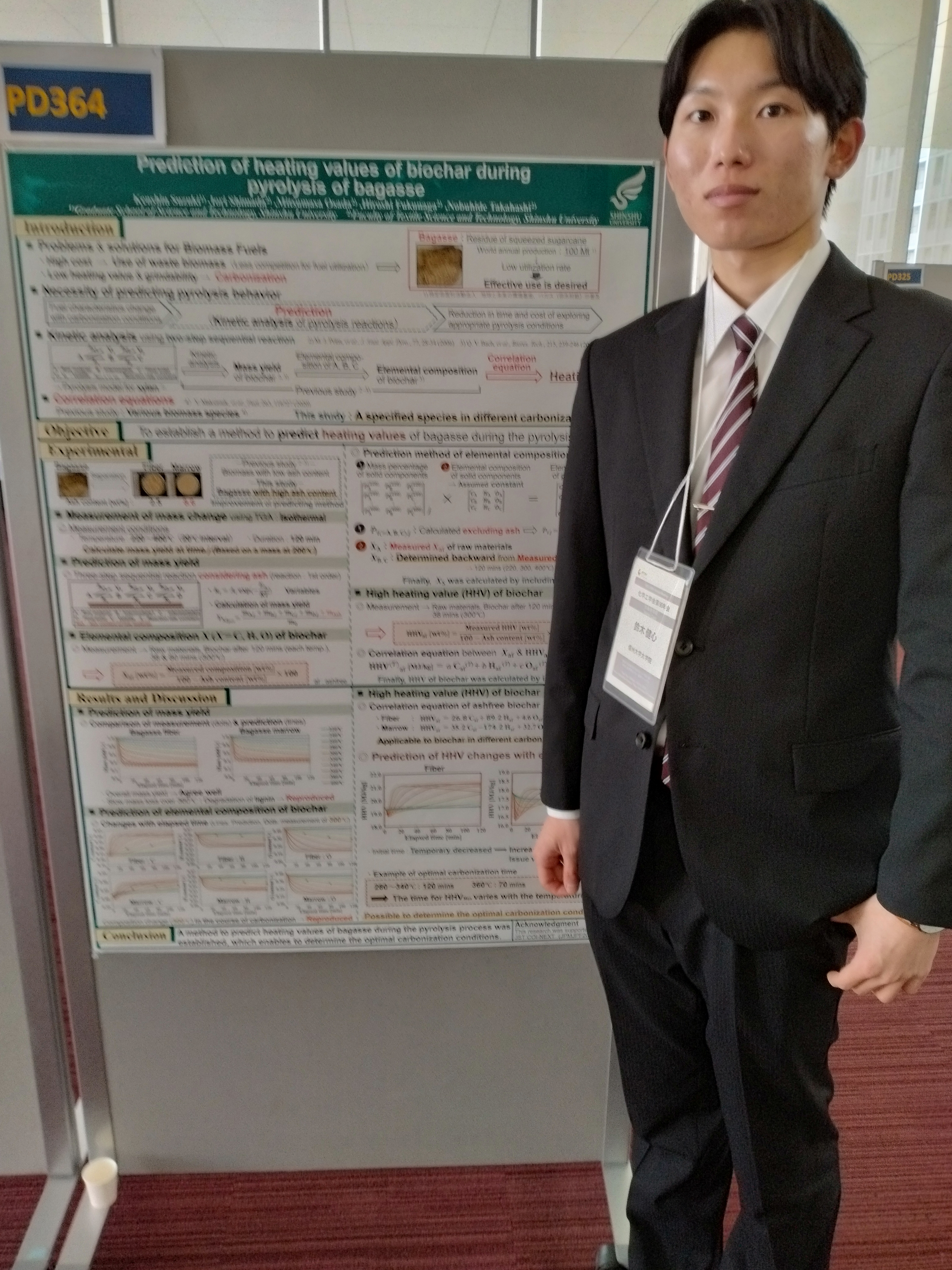 2023.8.8-9 第32回日本エネルギー学会大会にて、M1の鈴木健心君が「バガスの熱分解過程におけるバイオ炭収率の速度論的予測」という題目で口頭発表を行いました。