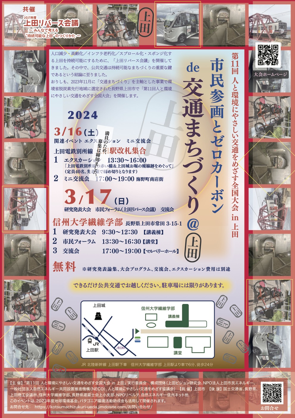2024.3.16-17 「第11回人と環境にやさしい交通を目指す全国大会in上田」を 、実行委員長として信州大学繊維学部で開催しました。午前の研究発表大会では53件の研究発表を行いました。午後の市民フォーラムでは、栃木県小山市の公共バスの乗客増を主導した淺見知秀氏から基調講演をいただき、長野県知事の阿部守一氏、上田市長の土屋陽一氏にもパネリストとしてご登壇いただきました。約200人の上田市民、県内外からの参加者とともに、公共交通のあり方について議論しました。