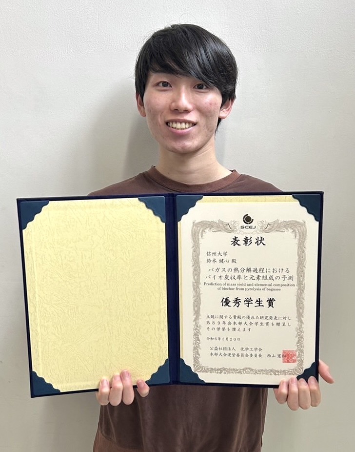 鈴木君が化学工学会第89年会で優秀学生賞を受賞しました!!