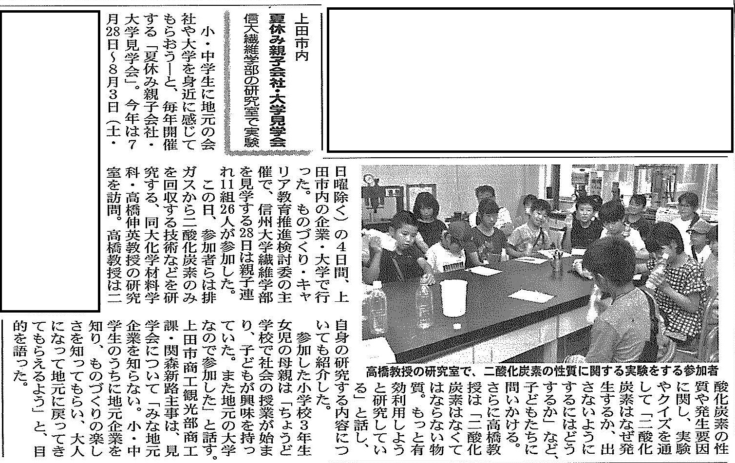 2017.7.30 上田市役所の企画「夏休み親子会社・大学見学会」で、30名の小学生とその保護者の方を大学に迎え、地球温暖化に関する講義と実験を行いました。