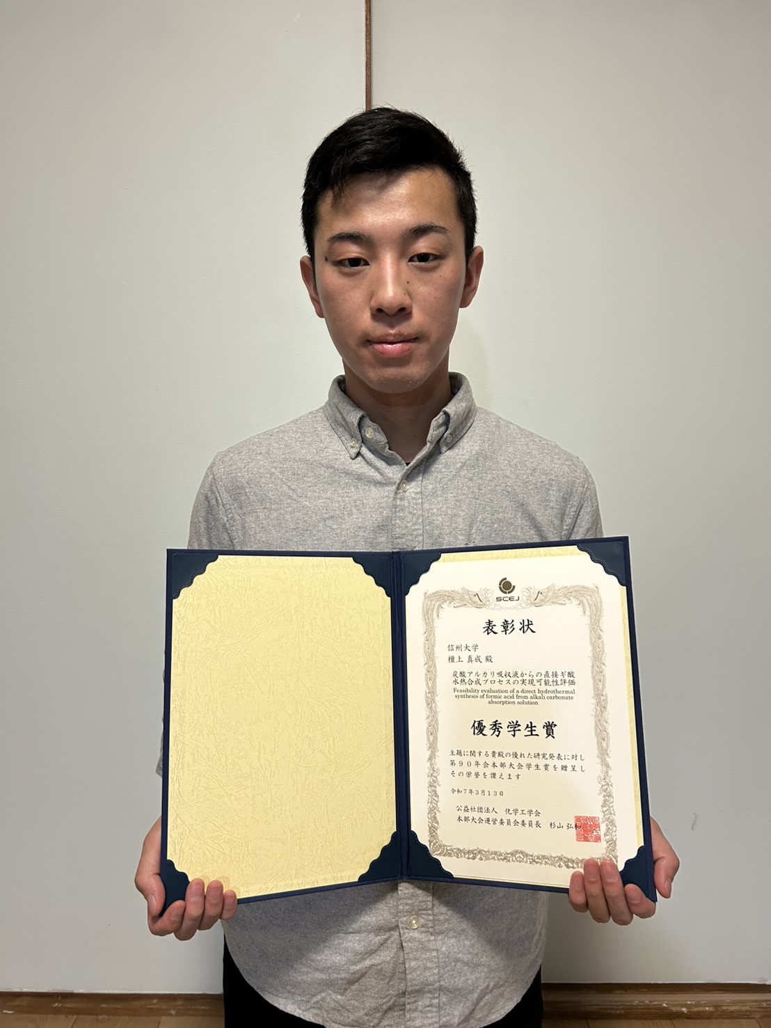 鈴木君が化学工学会第89年会で優秀学生賞を受賞しました!!